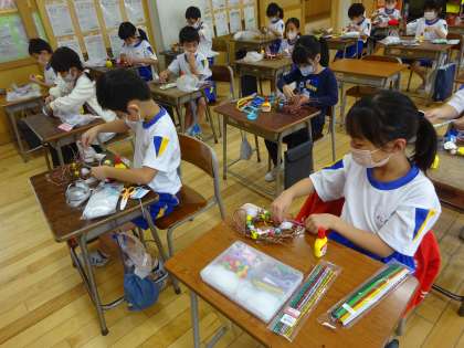 春に植えたあさがおは、芽を出し、つるを伸ばし、花を開いて、やがて種となりました。最後はつるをまとめて、自分の育てたあさがおのリースをつくりました。家から持ってきた飾りを付けて、素敵なリースができあがりました。植物の命を感じながら、生活科の学びを進めていった子供たちでした。