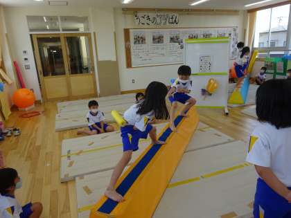 すもう遊びは、「かかしずもう」「ておしずもう」「かえるずもう」「ぼうずもう」「ひもずもう」「バランスボールずもう」の6種類を行っています。それぞれに運動の特性が違い、子供たちは夢中になって運動に取り組む中で様々な運動の能力を身に付けています。