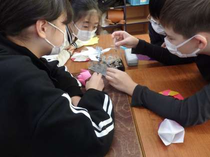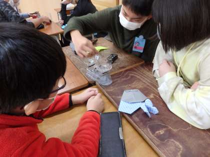 理科の学習では、加える力の位置や大きさに着目しながら、てこの働きについて考えています。今日は、上皿天秤がてこのきまりを利用していることを確認した後、分銅を使って身の回りのものの重さを量りました。分銅の組合せによってmg単位まで量ることに驚きつつ、天秤が水平になるよう分銅を乗せて計測していました。
