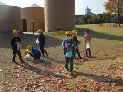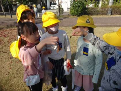 生活科の学習で奥田公園へ行き、秋のものをたくさん見付けました。子供たちは葉やどんぐりの色の違いを比べたり、葉の模様をじっくり観察したりしていました。また、見付けたものを友達と見せ合いながら、秋を堪能していました。