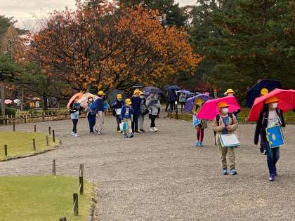小雨の降る中、兼六園を散策しました。平日にもかかわらず、大勢の観光客が訪れていますが、さわやかな挨拶をしながら、秋の園庭の美を満喫していました。