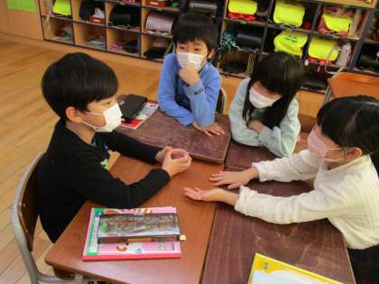 国語科「そうだんにのってください」では、グループで考えを出し合う学習をしています。グループで考えを出し合う中で、「友達の話をよく聴いて、分かろうとすることがつなげることになると思うな」「友達の話を考えながら聴いて、話がつながるようにしたいな」と学習を通して身に付けたい力やどのように学んでいきたいかなど考える姿が見られました。