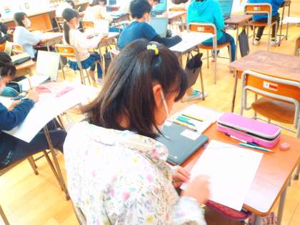 総合的な学習の時間では、「ふるさと富山の魅力を学ぼう・伝えよう」という課題で学習に取り組んでいます。自分でテーマを決めて学習を進め、12月には4年生に自分が調べたことを発表します。4年生に伝わるような発表にするにはどうしたらよいか、どんなふうに伝えればよいのかを考え、取り組んでいる子供たちです。