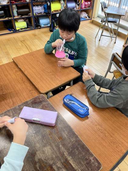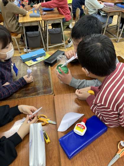 理科では、「音を出して調べよう」という単元に入りました。今日は、プラスチックコップと風船、ビーズでつくった装置で、音を出して気付いたことを聴き合いました。「ビーズが動いたのは、声で風船が小さく動いたからだと思うよ」「大きい声を出すと、ビーズがたくさん動くよ」等、音と振動との関係に気付いた子供たちでした。