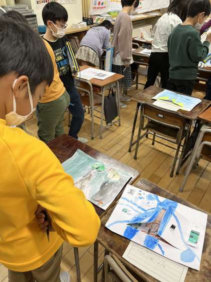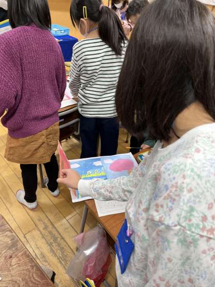 図画工作科では、扉を開くと広がっている不思議な世界を表現した絵を描きました。今日は、完成した作品を鑑賞し合いました。「トマトが扉になっていて、開くとありがたくさんいるなんて、僕には思いつかない発想でおもしろいな」「扉を開く前と開いた後で、全然違う世界が広がっていてすごい」等の感想が聞かれました。友達の作品の扉をわくわくしながら楽しそうに開く子供たちでした。
