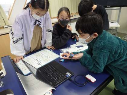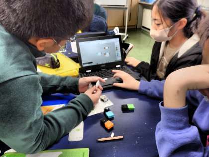 「MESH」というプログラミング教材を使って、電気を効率よく使うためのプログラムをChromebookでつくっています。「暗くなったらLEDが光る」「ボタンを押したらLEDが消える」等、照明や家電製品に使われているプログラムを再現しました。「こんなプログラムがあったらいいな」という思いをもち始めた子供が多く、活動が広がりつつあります。