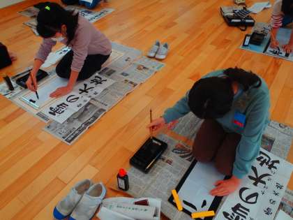 書初の練習が始まっています。てきぱきと準備を始め、練習を進めている様子が立派です。お手本をよく見て、丁寧に書いている子供たちです。