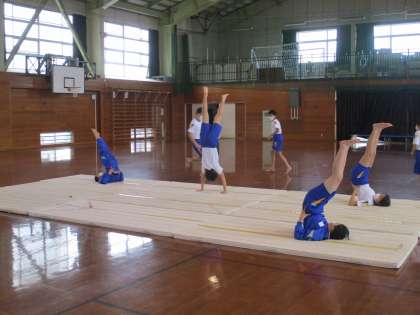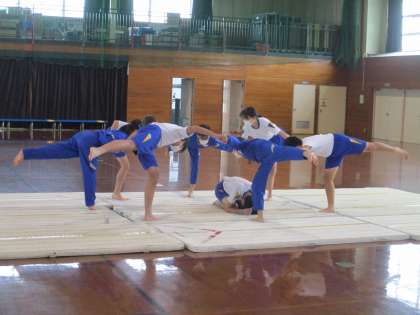 グループそれぞれに動きや構成の工夫があり、子供たちは手拍子をしながら演技を見守っていました。できる技が増えた喜びや、仲間と演技する楽しさを味わうことができた体育の学習となりました。