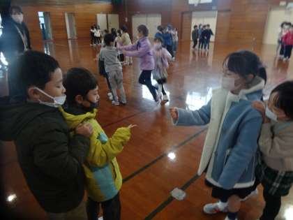 今日は、学年集会「2学期なかよし集会」を行いました。じゃんけん列車と爆弾ゲームをして、盛り上がりました。爆弾ゲームでは、ボールを持った人が2学期に楽しかったことを発表し、「ファミリーパークが楽しかったです」「学習発表会でくじらぐも役をやったことが楽しかったです」と話していました。