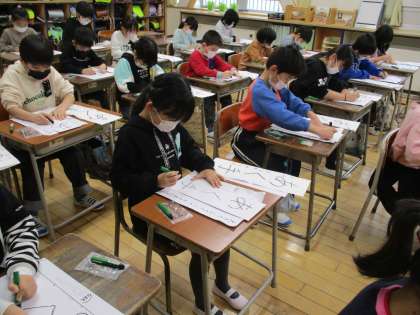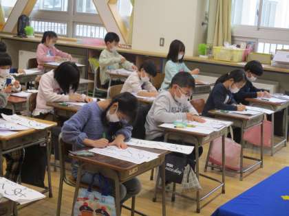 校内書初大会では、これまでの練習の成果を発揮しようと集中して取り組む姿が見られました。冬休みの間、練習に励んだことが伝わりました。