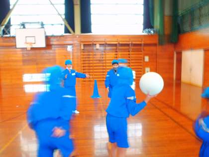 体育科ではボールを使った巧みな運動に取り組んでいます。色団で作戦をたてたり、声を掛け合ったりしながらボールを使った運動に親しんでいます。