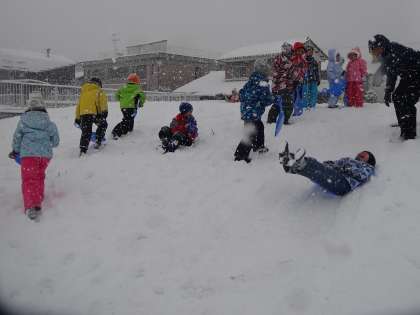 今日は久しぶりに雪が積もり、子供たちは朝から雪遊びを楽しみにしていました。今年は、学校でそりを購入しました。子供たちは、グラウンドの山でそり遊びを楽しみました。友達とどこまで行けるか競争したり、速く滑る方法を考えたりしながら、何度もそりに挑戦していました。
