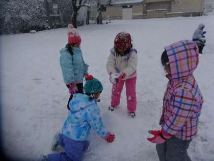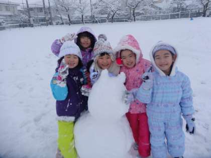 子供たちは、グラウンドいっぱいに積もった雪で、思い思いの遊びをしていました。友達と、大きな雪だるまや雪山をつくったり、雪合戦をしたりと、楽しんで体を動かしていました。