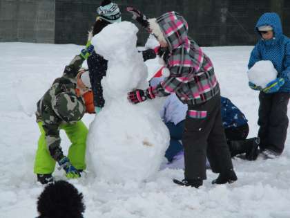 グラウンドに雪がたくさん積もりました。子供たちは、寒さに負けず元気に雪遊びをしました。雪山からそりで滑ったり、各団で力を合わせて雪だるまの世界をつくったりして楽しみました。「こんな風に滑ると、うまく滑ることができるよ」と滑り方を共有したり、「みんなで協力したら、大きい雪だるまをつくることができたね」とみんなでつくることのよさを実感していました。