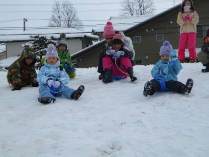 グラウンドに雪がたくさん積もりました。子供たちは、寒さに負けず元気に雪遊びをしました。雪山からそりで滑ったり、各団で力を合わせて雪だるまの世界をつくったりして楽しみました。「こんな風に滑ると、うまく滑ることができるよ」と滑り方を共有したり、「みんなで協力したら、大きい雪だるまをつくることができたね」とみんなでつくることのよさを実感していました。