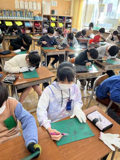 図画工作科では、版画に取り組んでいます。はじめて彫刻刀を使う子供たちは、少し緊張しながらも、静かに集中して彫り進めています。