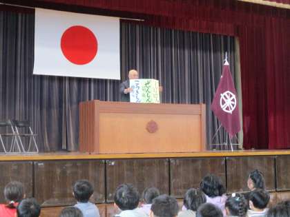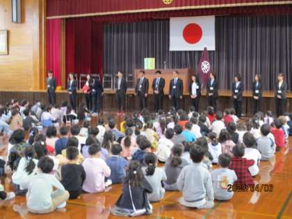 着任式では、校長先生が着任教職員を紹介し、その後、新しく着任された教職員が挨拶しました。新しい先生と出会い、奥田っ子は「どんな先生だろう」と心をわくわくさせていました。
