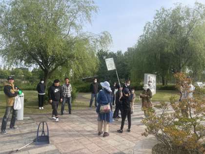 5/13(土)早朝、環水公園に立つおっくんの旗の下に奥田っ子とPTAが集合しました。