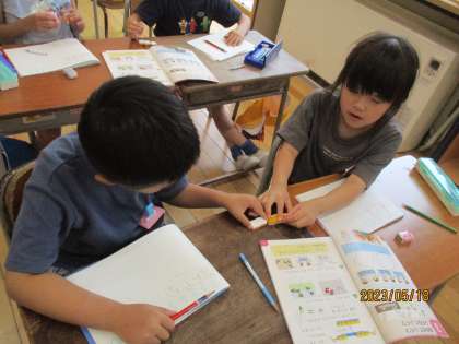 教科書の問題の絵に合わせて、ペアでブロックを操作しながら、「金魚が3匹と金魚が2匹いるね」「一緒の水槽に入るから合わせると・・・」と問題の意味について考えました。
