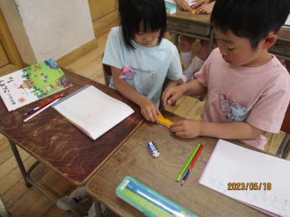教科書の問題の絵に合わせて、ペアでブロックを操作しながら、「金魚が3匹と金魚が2匹いるね」「一緒の水槽に入るから合わせると・・・」と問題の意味について考えました。