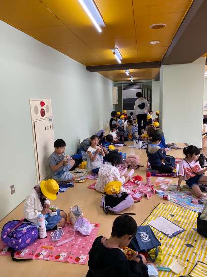 水族館の見学を終え、昼食です。あいにくの天気で、休憩所の中で食べています。うれしそうに、楽しそうにいただいています。