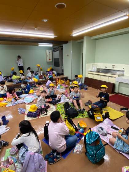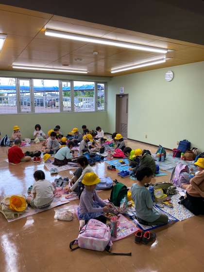 水族館の見学を終え、昼食です。あいにくの天気で、休憩所の中で食べています。うれしそうに、楽しそうにいただいています。