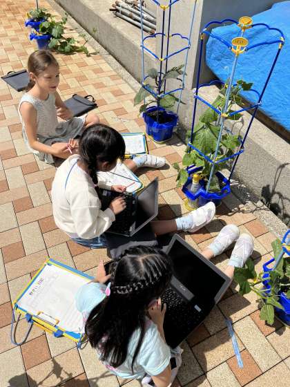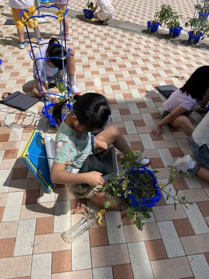 生活科では、野菜を育てています。子供たちは自分で選んだ野菜に愛着をもって、毎日水やりをしたり観察したりしています。6月になり、実がついてきた野菜も多く、収穫を心待ちにする様子が見られます。