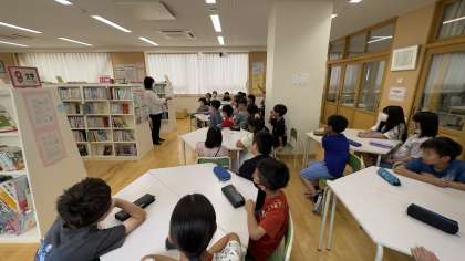図書室の小野先生と一緒に、「百科事典の使い方」を学びました。百科事典に関する紙芝居を聞いたり、実際に事柄を検索したりする活動をしました。