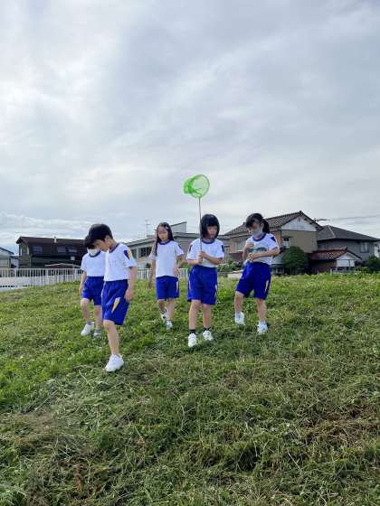 今日は、グループで飼育する生き物をグラウンドに探しに行きました。生き物が過ごしやすい環境を事前に調べ、そのような環境を虫かごの中につくろうと、えさや隠れ家を探す子供もいました。