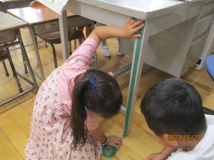 算数科では、長さの学習をしています。調べたい長さをテープに写し取り、「こっちの方が長いね」「はしをそろえて真っ直ぐ伸ばして比べると分かるよ」等と、ペアで話しながら長さ比べに取り組んでいました。