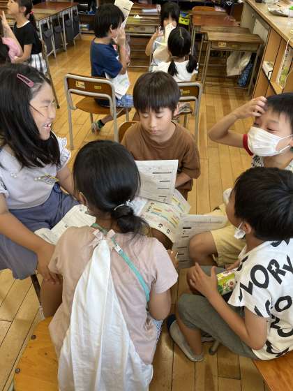音楽科では、身の回りの音を声で表して音楽をつくる学習をしました。雨がたくさん降る音は「ザーザー」、皿が割れる音は「ザンッ」等、様々な音を声で表しました。