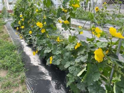 夏の暑さや強い日差しに負けずに成長してきた畑のヘチマに鮮やかな花が咲きました。ヘチマの花は朝に開き、夕方頃にはしぼんでしまうため、花の蜜を目当てにやって来たチョウやハチ達は、花から花へ忙しそうに飛び回っていました。