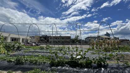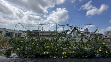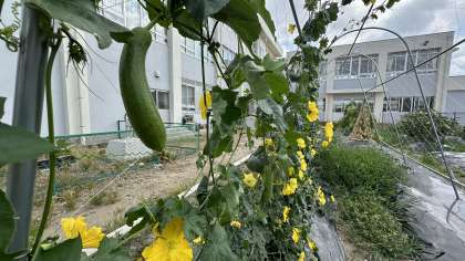 1学期から育てているヘチマが元気に育っています。1枚目は、8月7日の写真で、2、3枚目は8月21日の写真です。2週間でとても大きく育ちました。