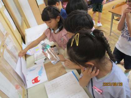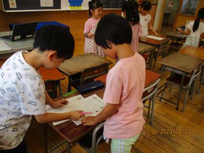夏休みビンゴや思い出じゃんけんゲームでは、楽しそうに友達に夏休みの話をする様子がありました。また、友達の自由研究を見て、「こんなに素敵な物が作れるなんてすごいな」等と伝えていました。
