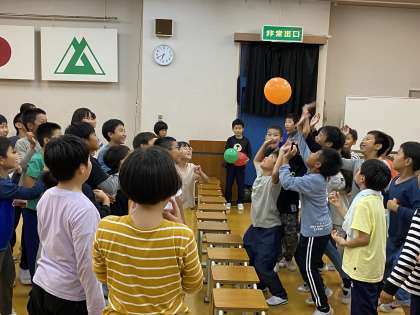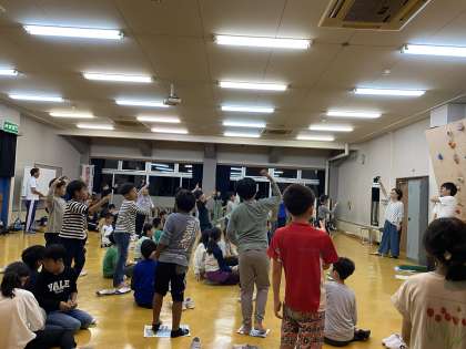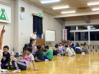 夜の活動は、月光ハイクを予定していましたが、雨天のため、学年集会をしました。風船バレーや新聞ジャンケン、そして、最後にクイズをしました。個人で頑張ったり、班や色団の友達と協力して頑張ったりと、楽しいひと時を過ごしました。この後は、入浴、荷物整理をして就寝となります。