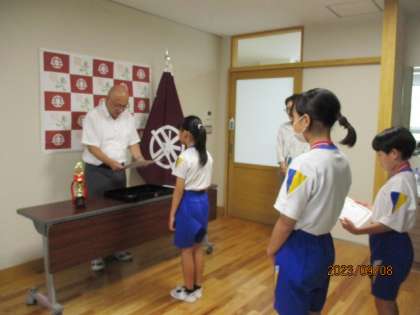 校長室で地域のミニバスケットボール教室に通う子供たちの表彰式が行われました。さまざまな大会で優秀な成績をおさめるためには、きっとたくさんの努力があったはずです。