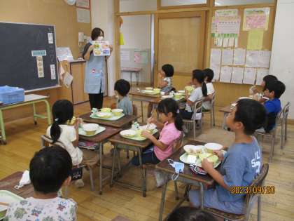栄養教諭から食育ランチマットについての話を聞きました。その際、栄養バランスのことや箸の使い方等についても教わりました。
