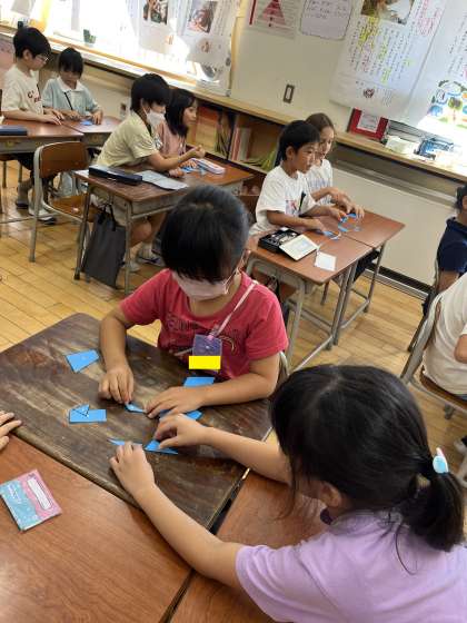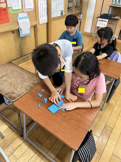 算数科では、パズルを使って、三角と四角の形の特徴を調べました。パズルを2つの仲間に分ける活動をする中で、子供たちは辺、頂点が3つある図形が三角形、辺、頂点が4つある図形が四角形だと気付いていきました。