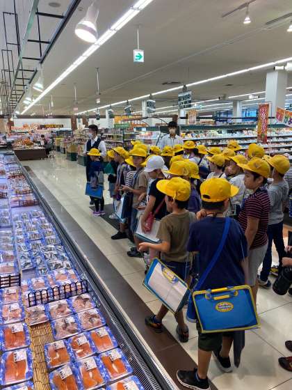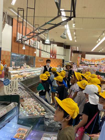 3年生は、社会科の学習で、スーパーマーケット アルビス奥田店に校外学習に来ています。店長さんから、魚コーナー、お寿司コーナー、お惣菜コーナーの説明を聞きました。