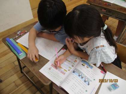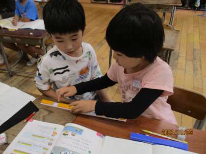 算数科では「たしざん」の学習をしています。計算の仕方について、「10をつくると計算ができるから・・・」と友達と考えながら、問題に取り組んでいます。