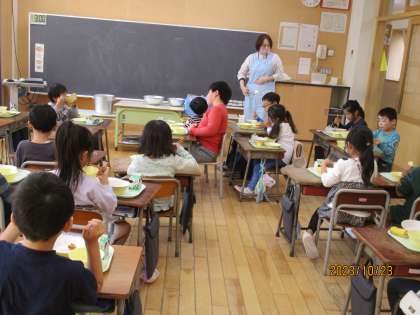 1年3組で栄養教諭による給食時教室訪問がありました。(1組は16日、2組は18日に実施しました)