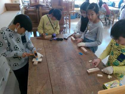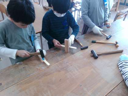 図画工作科の学習で、金づちと釘を使って工作を行いました。どのような物をつくっていくかや、木と木をつなぐためにはどのように釘を打てばよいかについて、友達と話し合いながら楽しく活動しました。