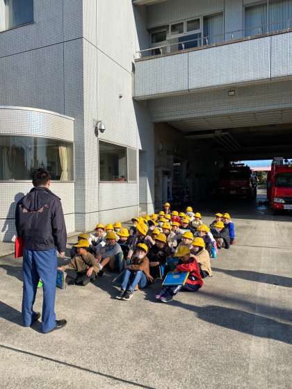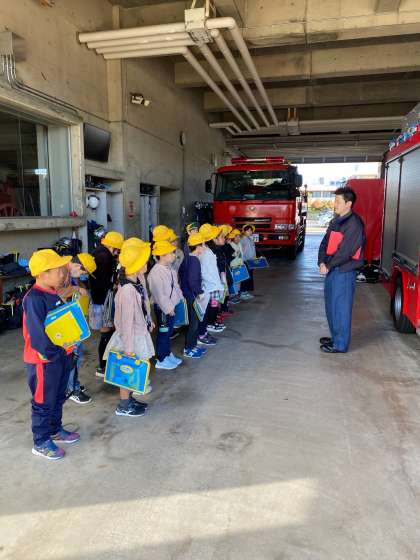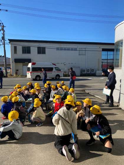 3年生は、社会科見学で富山消防署と富山市民俗民芸村を見学します。消防署に着いて、すぐに救急車の出動を見ました。また、消防隊員の方から消防についていろいろ説明を聞いています。