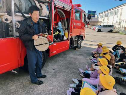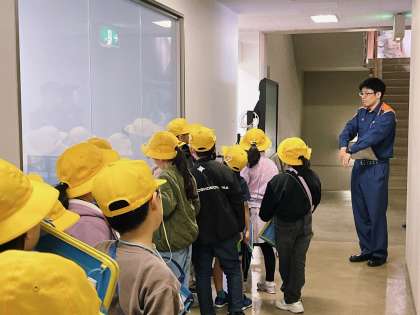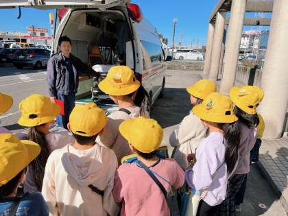 B班が消防局に到着しました。救急車、消防車の中にはどんな設備があるのかを見せていただいたり、通信司令室の役割についてお話を聞いたりしました。