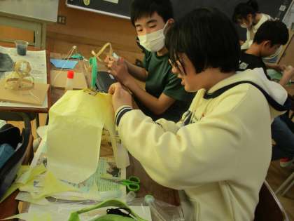 図画工作科では、「すてきな明かり」という単元の学習に取り組んでいます。「ランプの明かりがどんなふうにもれてくるときれいかな」と形や和紙の色を工夫しながらつくっている子供たちです。