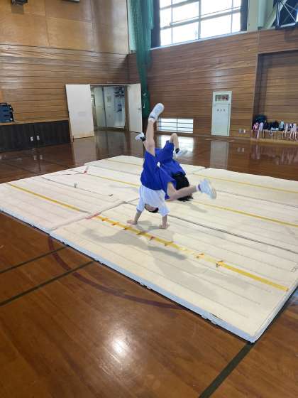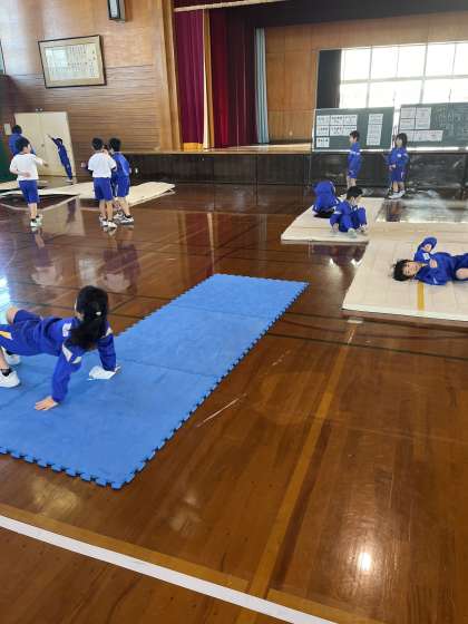 体育科では、マット運動の学習をしています。段ボール箱を岩に見立てて置いた岩ランド、マットをくねくねに置いたくねくねランド、マットで広い場を作った広々ランド等、様々なマットを使った場で運動しています。友達と見合ったり、技をそろえたりしながら楽しんで活動しています。