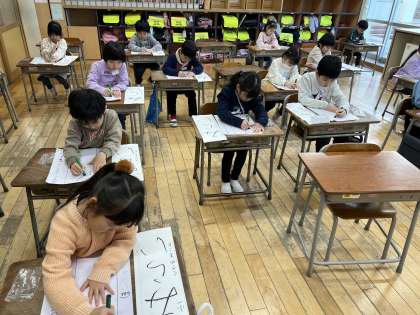 今日から3学期が始まりました。始業式の後に行われた書初大会では、これまでの練習の成果を出そうと自信をもって取り組んでいました。