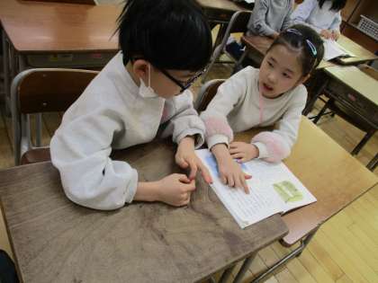 国語科では「たぬきの糸車」の学習をしています。ペアや全体の友達と音読したり考えを聴き合ったりしながら、好きなところを見付けている子供たちです。