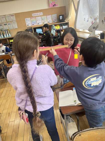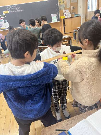 算数科では、長さについて学習しています。今日は、手を広げて「ひろ(両手を水平に広げた長さ)」の長さを30cmものさしを使って測りました。30cmものさしをつぎたして測る大変さを実感し、メートルという単位のよさに気付いた子供たちでした。