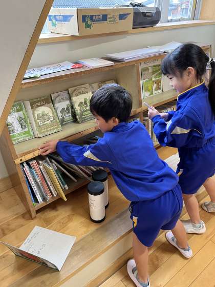 2年生は、算数科で「メートル」という単位を新しく学習しました。今日は、だいたい1メートルだと思う物を学校の中で見付け、「ピタリ賞」かどうかをものさしを使って確かめました。